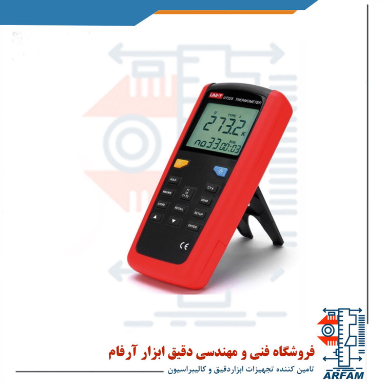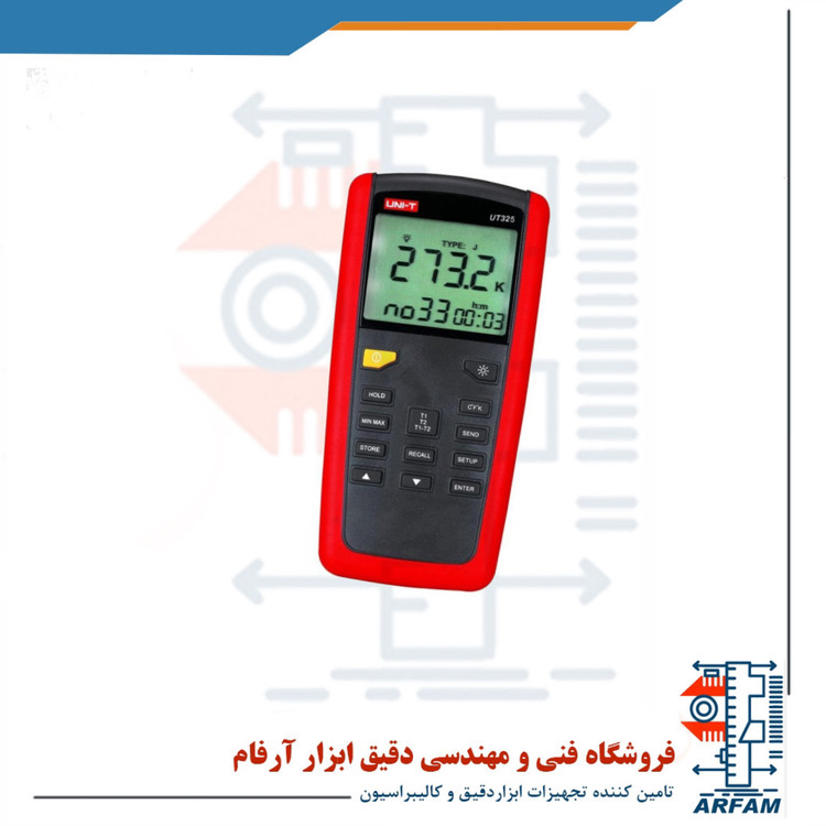ترمومتر دوکانال دیجیتال مدل UT-325 ، ترمومتر دوکاناله مولتی ترموکوبل میتواند برای اندازه گیری دما از -200 تا +1372 استفاده شود که قابلیت اتصال به کامپیوتر را دارد و همچنین این دستگاه به همراه کابل و نرم افزار مربوطه می باشد. که در این نوع ترمومتر مبادله اطلاعات به وسیله USB و نرم افزار کامپیوتر انجام میشود.