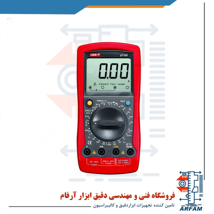 به صورت تخصصی برای استفاده در عیب یابی اتومبیل ها طراحی شده که عملکرد و توابع این دستگاه RPM، DWELL و دیگر توابع از قابلیت های این دستگاه می باشد این سری از مولتیمتر برای تعمیر نگهداری وعیب یابی خودرو ها به ویژه خودروهای هیبریدی بسیار پرکاربرد و مفید میباشد . این مولتی متر قابلیت اندازه گیری تعداد دور قسمت مقسم برق خودرو ( دلکو ) را در موتور های 4 ، 6 و 8 سیلندر داشته و میتواند از آن در تست سایر قطعات برقی از جمله رله ها ، فیوزها ، سلونوئید ها و سیستم برقی سوخت رسانی استفاده کرد. مولتی متر دیجیتال یونی تی مدل UNI-T UT-105 یک مولتی متر با کیفیت و ارزان قیمت است. مولتی متر دیجیتال یونی تی مدل UNI-T UT-105 یک مولتی متر با کیفیت و ارزان قیمت است.