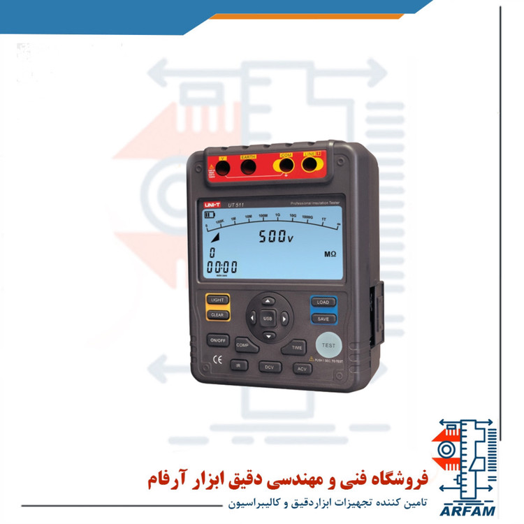 میگر دیجیتال یونیتی UNI-T UT511 یکی از از پرفروش ترین دستگاه های تست عایق موجود در بازار می باشد که دارای کیفیت فوق العاده و قابلیت اندازه گیری مقاومت عایق از 0.1MΩ تا 10GΩ می باشد. ولتاژ تست این کد محصول در 4رنج 1000V/500V/250V/100V می باشد همچنین توانایی اندازه گیری ولتاژ متناوب را نیز دارد