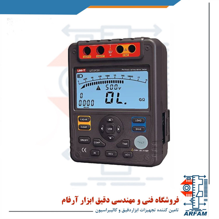 میگر 5 کیلو ولت یونیتی UNI-T UT513A یکی از دستگاه های تست عایق موجود در بازار می باشد که دارای کیفیت فوق العاده و قابلیت اندازه گیری مقاومت عایق از0.5MΩ تا 1000GΩ می باشد. ولتاژ تست این کد محصول در 4رنج 5000V/2500V/1000V/500V می باشد همچنین توانایی اندازه گیری ولتاژ متناوب را نیز دارد. کاربرد این دستگاه در اندازه گیری مقاومت عایق کابل ، ترانسفورماتورها و موتورها کاربرد دارد.یکی از دستگاه های تست عایق موجود در بازار می باشد که دارای کیفیت فوق العاده و قابلیت اندازه گیری مقاومت عایق از0.5MΩ تا 1000GΩ می باشد. ولتاژ تست این کد محصول در 4رنج 5000V/2500V/1000V/500V می باشد همچنین توانایی اندازه گیری ولتاژ متناوب را نیز دارد. کاربرد این دستگاه در اندازه گیری مقاومت عایق کابل ، ترانسفورماتورها و موتورها کاربرد داردمگا اهم متر 5 کیلوولت یونیتی UNI-T UT 513Aدستگاهی کاربردی با قابلیت اندزاه گیری مقاومت تا 1000 گیگا اهم تحت ولتاژ 5 کیلو ولت را دارد. این ولتاژ در 4 رنج اعمال میشود. از مهمترین ویژگی های این مگا اهم متر میتوان به قابلیت اندازه گیری ولتا ژAC و DC ، اندازه گیری شاخصه های PI و DAR ، ذخیره سازی 18 گروه داده و قابلیت اتصال آن به کامپیوتر اشاره کرد. این تستر مقاومت عایق دارای نمایشگر بزرگ به همراه بار گراف بوده که بر روی آن نشانگر های ولتاژ و نشانگر باتری به همراه نور پس زمینه وجود دارد. از دیگر ویژگی های این دستگاه داشتن تایمر و اندازه گیری اتوماتیک در مدت زمان 15 دقیقه، قابلیت مقایسه مقدار حد بالا و پایین مقاومت ، اندازه گیری پیوسته و خاموشی خودکار برای مصرف بهینه باتری ها اشاره کرد. جریان اتصال کوتاه در این مگا اهم متر بیش از 3 میلی آمپر است .