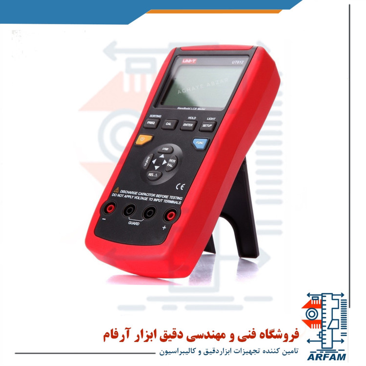 5-صفحه نمایش با قابلیت نمایش 20000 رقم.ویژگی هامحدودهUT612اندوکتانس (H)20uH~2000H±(0.5%+5)ظرفیت(F)200pF~20mF±(0.5%+5)مقاومت (Ω)20Ω~200MΩ±(0.3%+5)تست فرکانس(Hz)100Hz/120Hz/1kHz/10kHz/100kHz√ولتاژ کاری0.6Vrms√تست پارامترL/C/R/DCR/Q/D/θ/ESR√ویژگی قسمت هاشمارش نمایشگر 20000D/Q شمارش نمایشگر 2000D/Q رزولوشن0.001√رنج اتومات √تست واقعی فرکانس وزمان نمایشگر √حالت اندازه گیریSeries/Parallel√خاموش شدن خودکار صفحه √نشانگر سطح پایین باتری≤6.8V√فریز اطلاعات √حالت نسبی √USB رابط √USB درگاه/ذخیره سازی اطلاعات کامپیوتر 60000ذخیره اطلاعات √LCD نور پس زمینه 26بارگراف انالوگ برای نمایش مقادیر √توابع مقایسه √توابع کالیبراسیون √خروجی مقاومت ظاهری120Ω√اندازه گیری و چک کردن به صورت اتوماتیک LCR √مشخصات عمومی دستگاهتغذیه9V battery (6F22) or USBنمایشگر40mm x 63mmرنگ دستگاهRed and greyوزن دستگاه374gابعاد دستگاه96mm x 193mm x 47mmلوازم جانبی استانداردBattery, SMD test clamp, USB interface cable, multi-purpose socket, PC software CDلوازم جانبی اختیاریUSB adaptor
