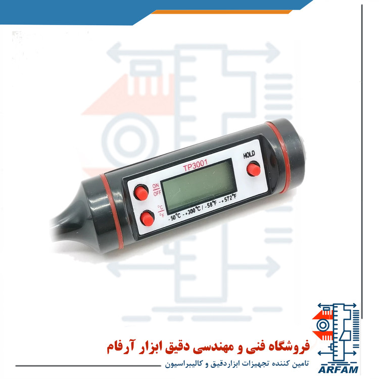 ترمومتر نفوذی مدل tp3001 یکی از ترمومتر های موجود در بازار است که برای اندازه گیری دمای محصولات غذایی و فاسد شدنی در یخچال ها و سرد خانه ها می باشد. دماسنج میله ای tp3001 دارای پراب ساخته شده از استیل ضد زنگ به طول 145 میلی متر است. ترمومتر میله ای tp3001 با توجه به سبکی و قابلیت حمل نظر مهندسان زیادی را به سوی خود جلب نموده است. دماسنج نفوذی tp 3001 می تواند دما را به دو واحد سانتی گراد و فارنهایت اندازه گیری نماید.