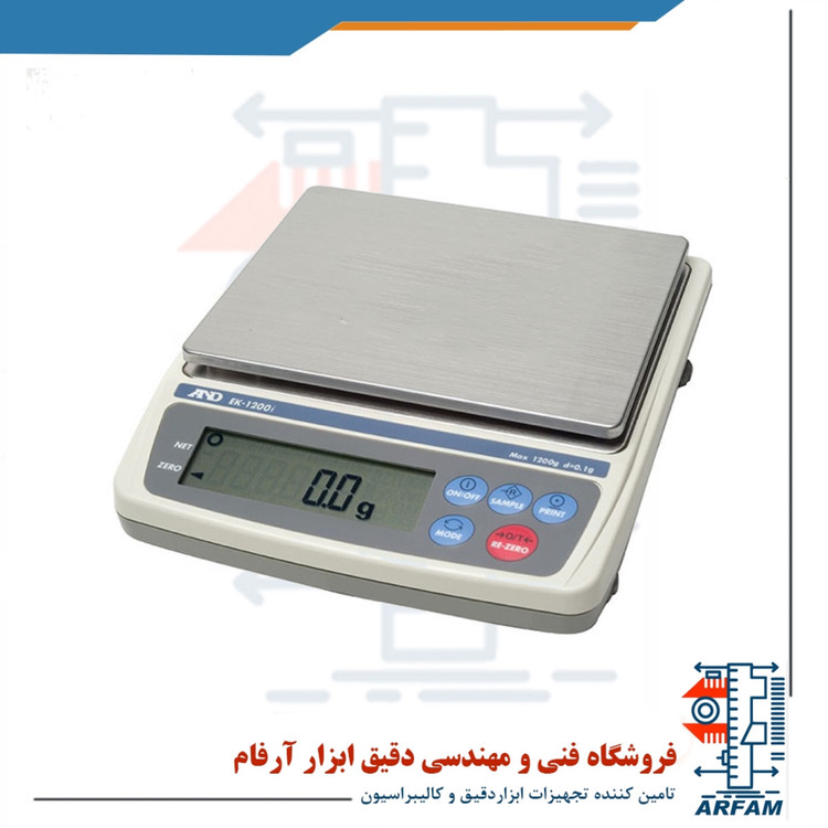 ترازوی AND مدل EK1200I، ترازویی قابل و پسندیده ایست که همراه آن گارانتی 1 ساله قرار دارد. این ابزار در دسته ترازوهای آزمایشگاهی و صنعتی قرار می گیرد که قادر به انجام عمل توزین با دقت بسیار بالایی است و دارای آپشن های به خصوصی می باشد. از اولین ویژگی و مهم ترین آن می توان به قابلیت قطعه شماری اشاره کرد که عمل شمردن قطعات را ممکن می کند همچنین این ترازوی and قادر بوده عمل توزین را با دقت 0.1 گرم برای ظرفیتی معادل 1200 گرم انجام دهد که این عمل را تنها در 1 ثانیه به انجام می رساند. اطلاعاتی که از نتیجه ی توزین بر روی صفحه نمایش نشان داده می شوند واضح بوده و به راحتی می توان این ارقام را دید. در جهت ثبت و ذخیره ی این اطلاعات، با استفاده از پورت مخصوص، به رایانه متصل شده و اطلاعات را انتقال و در جهت چاپ این اطلاعات ذخیره شده، با اتصال به دستگاه چاپگر این عمل صورت می گیرد. صفحه ی کیبورد یا همان دکمه های عملیاتی در قیمت جلو و در شیبی منعطف کنار صفحه نمایش قرار گرفته اند که ترکیب رنگی آبی و قرمز دارند.