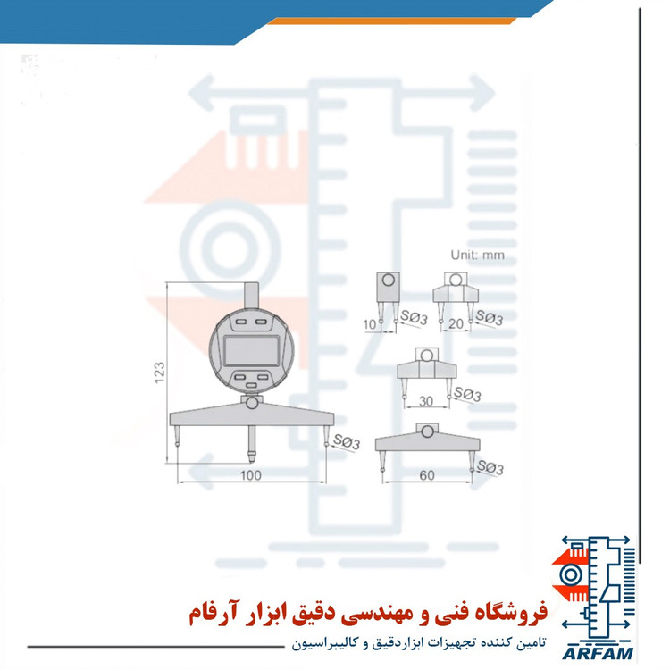 •دارای 5 عدد پایه و فک 10 - 20 - 30 - 60 - 100 میلی متر پنل مجهز به کلید خاموش/روشن، اینچ/میلی متر، Select Jaws ،Hold و صفر