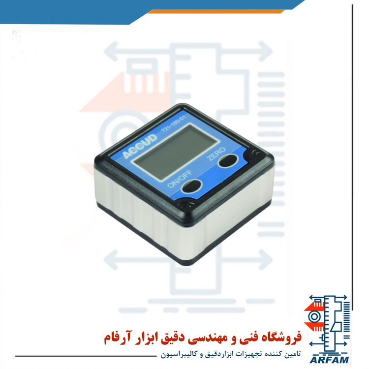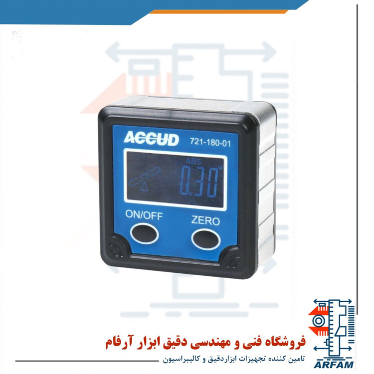 زاویه سنج وشیب سنج دیجیتال مگنتی مدل 721-180-01 ساخته شده در شرکت Accud ( آکاد ) از دسته زاویه سنج وشیب سنج های با کیفیت و دقیق موجود در بازار می باشد. زاویه سنج وشیب سنج ها ی صنعتی معمولا در کارگاه ها و کارخانه های صنایع مختلف جهت تنظیم و نصب دستگاه های و تجهیزات به کار می رود. زاویه سنج وشیب سنج دیجیتال آکاد با پایه ی مگنتی که به نام های شیب سنج دیجیتال ، زاویه سنج مگنتی و ... معروف است به سطح مورد نظر ( از جنس آهن ) می چسبد و امکان اندازه گیری دقیق میزان شیب صافی سطح مورد نظر را فراهم می آورد. ویژگی خاصی که در این زاویه سنج وشیب سنج وجود دارد قابلیت استفاده در 4 جهت می باشد. محدوده ی اندازه گیری این شیب سنج 0 تا 360 درجه ( 90 * 4 ) است. این ابزار دارای خطای اندازه گیری ±0.1 درجه در جهت افقی و عمودی و ±0.2 درجه در جهت های دیگر و دقت 0.1 درجه در بازه ی 1 متری است. همچنین حافظه ی نامحدود در جهت افقی ، دکمه پاور ، صفر و امکان خاموش شدن خودکار از دیگر نکات با اهمیت در این زاویه سنج وشیب سنج می باشد.