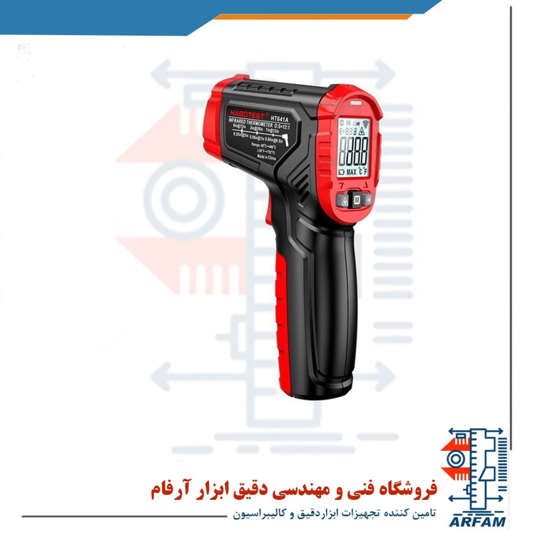 HT-641A از برند هابوتست ابزاری قدرتمند جهت اندازهگیری دما است که با سرعت و دقتی بالا دمای اجسام را مشخص میکند. انرژی این محصول توسط دو عدد باتری قلمی تأمین میشود و در کمتر از 0.5 ثانیه عمل میکند. همچنین این دستگاه میتواند پرتو لیزری دستگاه را روی سطح مورد نظر قرار دهد تا دادهها را به دست آورد. سنسور این ترمومتر در محدوده 40- تا 400 درجه سانتیگراد عمل میکند. با خرید این دماسنج یا ترمومتر لیزری صنعتی میتوان دمای اجسام در حال حرکت را بررسی کرد و دمای جسم را بدون تماس در فاصله 50 متری، اندازه گرفت.