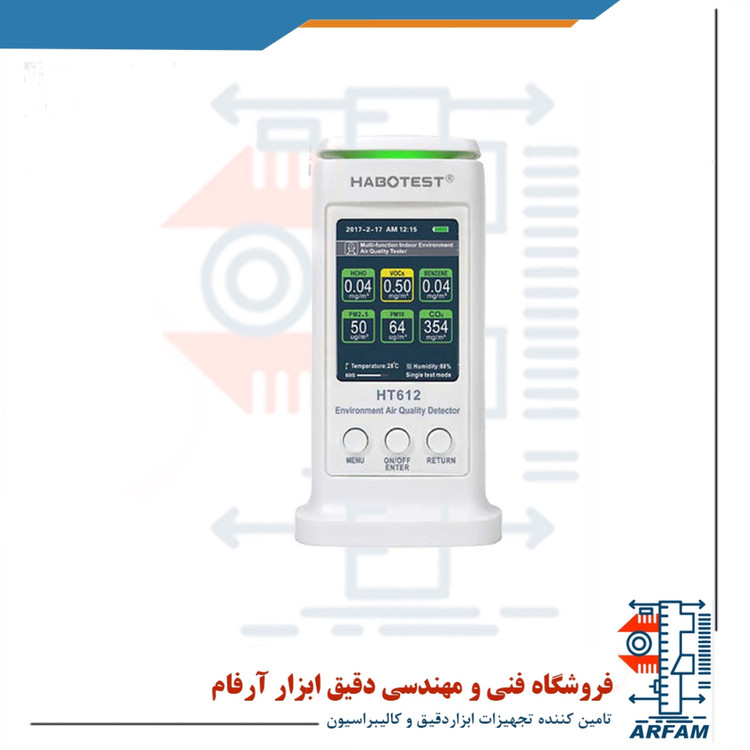 رف سازی 1 PPM و دقت 3% است.دستگاه HT612، یک سنجش کیفیت هوا در محیط داخلی با نمایش به صورت آنالوگ و دیجیتال است که قادراست مجموع ترکیبات آلی (TVOC) و CO2، بنزن و فرمالدئیدHCHO))، دما ، رطوبت و ذرات معلق در هوا(PM) را اندازه گیری کند. این دستگاه مناسب برای بهسازی کیفیت هوا منزل و آشکارساز آلودگی هوا می باشد. این دستگاه می تواند مجموع ترکیبات آلی (TVOC) را بین 0 تا 3 mg / m3 با میزان برطرف سازی 0.01 mg / m3 با دقت ±10% اندازه گیری کند. همچنین فرمالدئیدHCHO)) را بین 0 تا 9.99 mg / m3 با میزان برطرف سازی 0.01 mg / m3 با دقت ±10% اندازه گیری میکند. این دستگاه بنزن را بین 0تا 9.99mg / m3 با میزان برطرف سازی 0.01 mg / m3 با دقت ±10% اندازه گیری میکند. میزان اندازه گیری ذرات معلق در هوا (PM2.5) بین 0 تا 999 ug / m3 با میزان برطرف سازی 1 ug / m3 و دقت ±10% است و میزان اندازه گیری ذرات معلق در هوا (PM10) بین 0 تا 999 ug / m3 با میزان برطرف سازی 1 ug / m3 و دقت ±10% است .دما در این دستگاه بین -10 تا 50 درجه سانتی گراد با میزان برطرف سازی1 درجه با دقت ±1.5 درجه می باشد. میزان کربن دی اکسید در این دستگاه بین 0 تا 3000 PPM با میزان برطرف سازی 1 PPM و دقت 3% است.