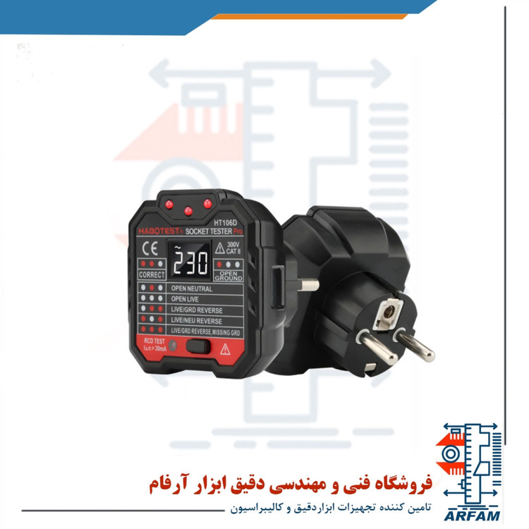 سوکت تستر مدل HT106D یک محصول کاربردی از کمپانی هابوتست می باشد که با سرعت و دقت بالا می تواند صحت اتصال سیم پریز را تشخیص دهد. همچنین دارای نمایشگر LCD با نور پس زمینه می باشد که میزان ولتاژ را نمایش داده و با نشانگرهای LED وضعیت پریز را نشان می دهد و بیانگر این است که فاز، نول و ارت سیم کشی ساختمان متصل است یا خیر. این تستر پریز که از طریق شرکت پترو پژوهش خاورمیانه(سهامی خاص) عرضه می گردد دارای ولتاژ و فرکانس بهره برداری (48V~250V/45~65Hz) می باشد. دارای تست RCD ، ارت، نول و محافظ جان بوده و از بروز خطاهای سیم کشی که منجر به آتش سوزی در منازل، کارخانه ها و … می شود، جلوگیری می نماید.