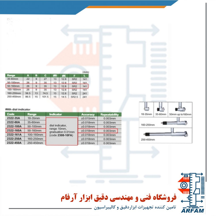 اطلاعات فنی بور گیج INSIZE 2322-160A سایز 160 - 50 میلی متر
