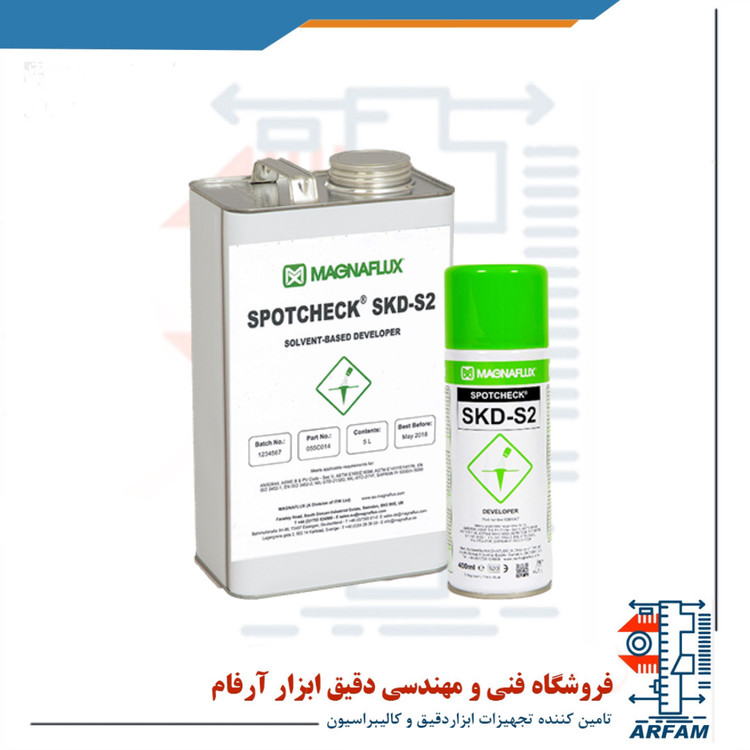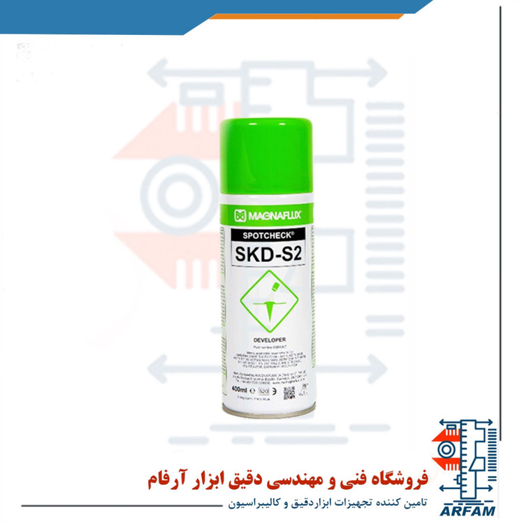 اسپری ظاهر کننده یا DEVELOPER با کد MAGNAFLUX SKD-S2 ساخت انگلستان آخرین اسپری از مراحل چهار گانه تست جوش ترکیابی مایعات نافذ یا همان PENETRANT TESTING میباشد که با اعمال این اسپری بر روی قطعه رنگ قرمز نفوذ کننده پنترنت SKL-SP2 از خلل و فرج ترک ها و عیوب سطحی بر روی سطح سفید احاطه شده از اسپری دولوپر مگنافلکس DEVELOPER SKD-S2 نمایان میگردد