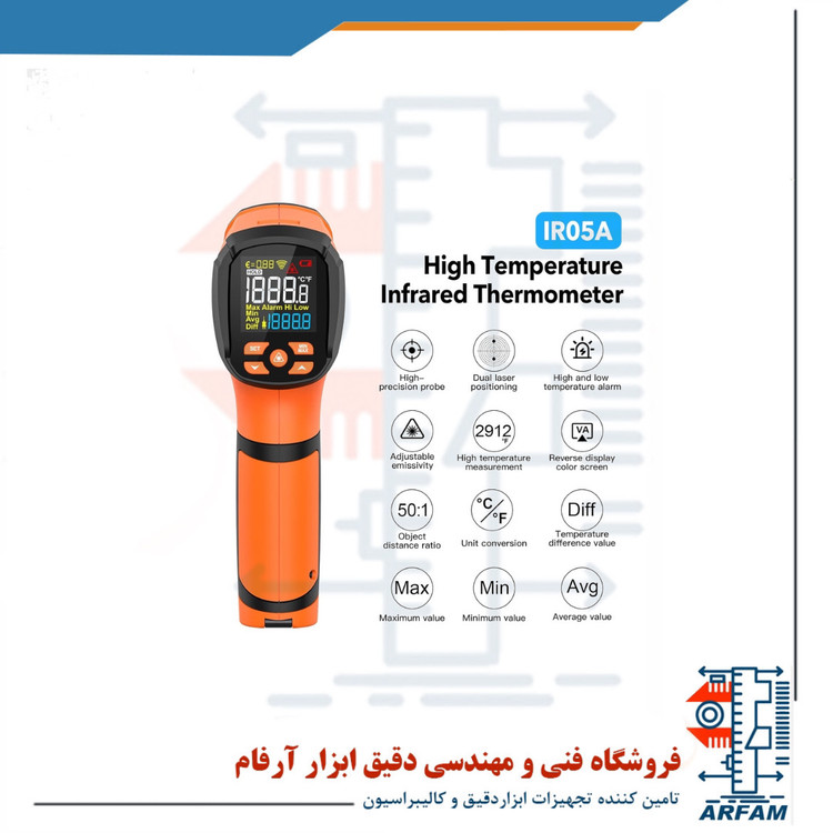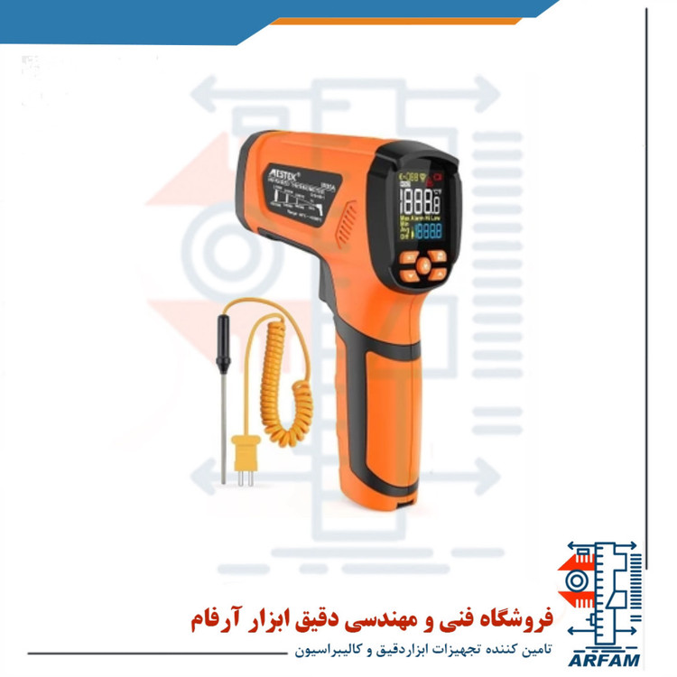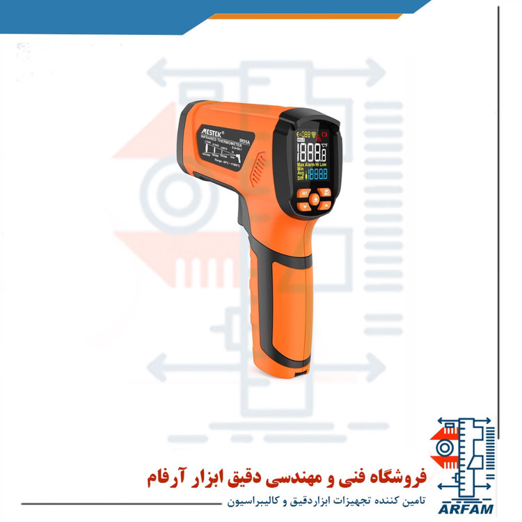 ترمومتر لیزری IR05A ساخت مستک چین یک ترمومتر لیزری مادون قرمزپر قدرت و جدید با گستره اندازه گیری -40 تا 1600 درجه سانتی گراد است . این دما سنج غیر تماسی برای کاربرد صنعتی و عمومی کاربرد دارد . این دماسنج لیزری می تواند دمای سطحی جسم هدف را در رنج 50- تا 1600 درجه سانتی گراد (58- تا 2192 درجه فارنهایت) اندازه گیری کند. همچنین نسبت فاصله به قطر اندازه گیری در این دستگاه 50:1 می باشد. از دیگر ویژگی های این دماسنج می توان به پشتیبانی از پراب اندازه گیری دما Type K با رنج اندازه گیری 50- تا 1370 درجه سانتی گراد (58- تا 2498 درجه فارنهایت)، حساسیت نوری قابل تنظیم، دقت و رزولوشن بالا، سرعت پاسخگویی بالا، صفحه نمایش LCD مجهز به نور پس زمینه است .
