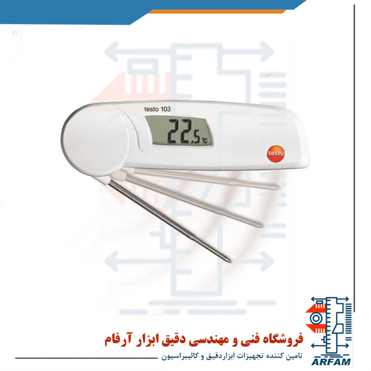 دماسنج میله ای نفوذی تاشو 220 درجه برند تستو مدل TESTO 103 ابزاری حرفه ای با کاربری آسان می باشد که به منظور اندازه گیری دمای مواد غذایی مختلف ساخته و عرضه بازار شده است. این دستگاه از 2 باتری لیتیومی CR2032 با طول عمر 300 ساعت تغدیه می کند و دارای یک صفحه نمایش LCD با نمایش 1 ردیف داده می باشد. به دلیل صرفه جویی در مصرف انرژی و افزایش طول عمر باتری دستگاه در صورت عدم استفاده پس از گذر 60 دقیقه به طور خودکار خاموش می شود. پراب این دستگاه تا زاویه 30 درجه باز شده و عمل اندازه گیری را به میزان چشمگیری آسان می نماید و توانسته رضایت کاربران زیادی را جلب نماید.