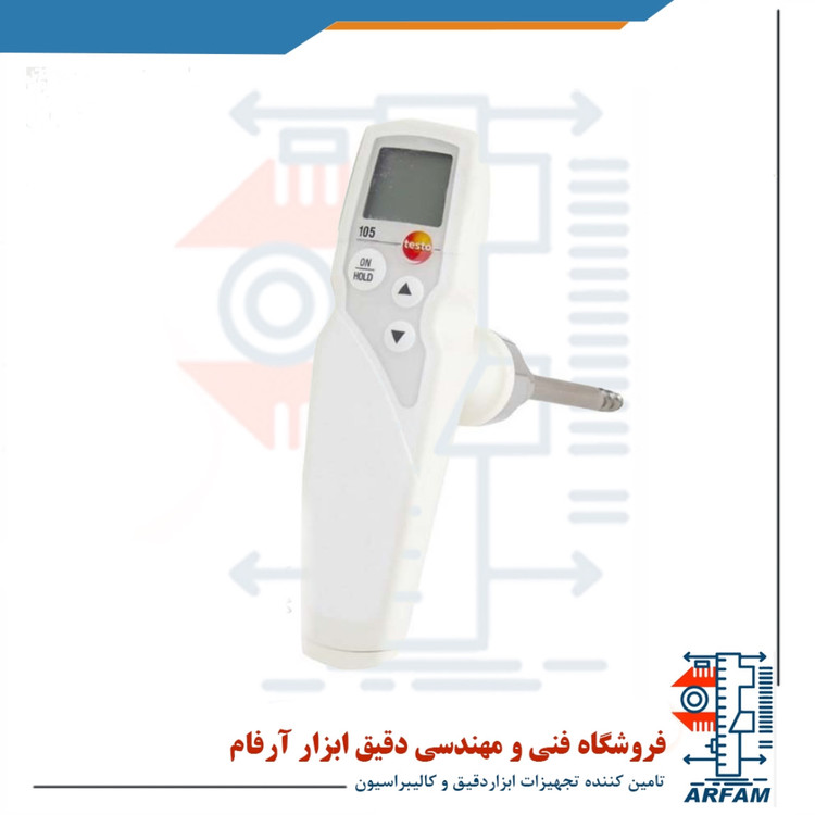 دماسنج میله ای مخصوص غذا های یخ زده برند تستو مدل TESTO 105 یک دماسنج ایده آل می باشد زیرا دقت بسیار بالایی داشته و بسیار سبک می باشد و این امر باعث کاربرد این دستگاه در بسیاری از مکان ها شده و توانسته توجه بسیاری از کاربران را جلب نماید. این دستگاه از یک باتری زیر سلولی LR44 با طول عمر 80 ساعت تغذیه می کند و به منظور صرفه جویی در مصرف انرژی و افزایش طول عمر باتری در صورت عدم استفاده پس از گذر 60 دقیقه به طور خودکار خاموش خواهد شد. این دستگاه دارای یک صفحه نمایش LCD با نمایش داده در یک خط می باشد که دارای نور پس زمینه می باشد و عمل اندازه گیری را در هر محیطی با هر شرایط نوری مهیا می کند. زنگ هشدار دستگاه در صورت رسیدن دما به حد بالا یا پایین تنظیم شده به منظور هشدار به کاربر روشن می شود تا مانع وقوع حوادث غیر مترقبه شده و از خسارات احتمالی بکاهد. هر دستگاهی پس از گذر مدت زمان خاصی در اثر شرایط محیطی و یا استفاده نادرست از حالت نرمال خارج می شود و نیاز به کالیبراسیون دارد، در نتیجه این دستگاه با دارا بودن قابلیت کالیبراسیون از دستگاه های مشابه خود پیشی گرفته است.