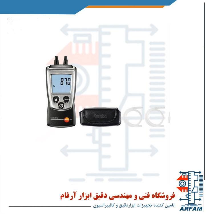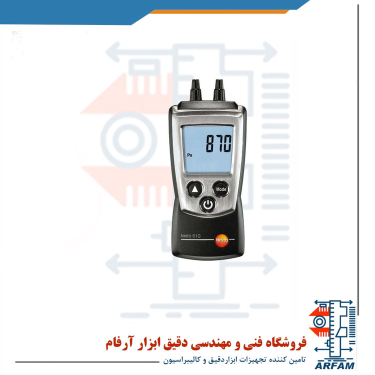 مانومتر تفاضلی دیجیتال و دبی سنج برند تستو مدل TESTO 510 یک وسیله اندازه گیری بسیار سبک و کوچک می باشد که با یک دست قابل استفاده است قادر به اندازه گیری اختلاف فشار و دبی عبوری هوا توسط لوله های پیتوت را داراست. این دستگاه همچنین دارای یک آهنربای نگهدارنده در پشت خود می باشد به به راحتی به سطوح فلزی چسبیده و موجب تسهیل در اندازه گیری می شود. با اتصال لوله پیتوت به این دستگاه کاربر قادر به اندازه گیری می باشد و به علت طول های مختلف لوله دسترسی به محل اندازه گیری بسیار آسان می شود. این دستگاه قادر به اندازه گیری اختلاف فشار از 0 تا 100 هکتو پاسکال و از 0 تا 40 اینچ آب می باشد.یک وسیله اندازه گیری ایمن، قابل اطمینان و بسیار سبک بوده که قابل استفاده در هر مکانی بوده و از دقت بسیار بالایی نیز برخوردار می باشد. از مشخصات فنی و کاربردی این دستگاه می توان به نور پس زمینه صفحه نمایش، 10 واحد اندازه گیری مختلف، سرعت اندازه گیری 0.5 ثانیه، فشار حداکثر برابر 201 اینچ آب یا 500 میلی بار و حداکثر فشار استاتیک برابر 603 اینچ آب یا 1.5 بار اشاره کرد و در دمای 0 تا 50 درجه سانتی گراد قابل استفاده می باشد.