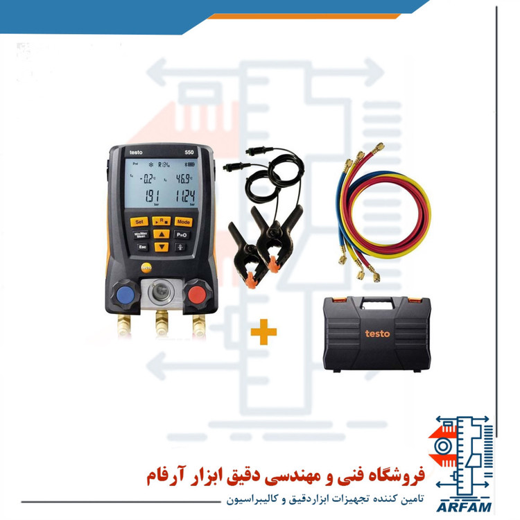 منیفولد دیجیتال TESTO 550یک وسیله دقیق و مقاوم مناسب استفاده روزمره در صنایع گرمایشی و سرمایشی است. شیرهای این دستگاه دو طرفه بوده و sight glass نیز دارند. 3 اتصال برای 3 شلنگ برای آن تعبیه شده تا شما بتوانید به سرعت و سادگی از آن ها استفاده کنید. این دستگاه دارای 2 سنسور فشار است که با آن ها می توان فشار زیاد و کم را با دقت بالا از -1 تا 60 بار اندازه گیری کرد. سنسور ها به صورت خودکار تاثیرات دمایی را حذف کرده و با تشخیص اتمی، دمای جوشش و میعان را تشخیص می دهند. علاوه بر آن دو ورودی برای پروب های دمایی NTC هم در آن در نظر گرفته شده تا محاسبات حالت های سوپرهیت و سابکولد به صورت آنی و خودکار انجام گیرد و علاوه بر آسان کردن کار، خطاهای محاسباتی را نیز کم کند. به همراه دستگاه دو پروب دما سنج گیره ای هم وجود دارد که با اتصال به سطح مسیر، دما را از 50- تا 150 درجه سانتیگراد می توان اندازه گرفت و به لطف پمپ حرارتی موجود در دستگاه، نیازی به جابه جای شیلنگ های متصل نیز نخواهد بود.