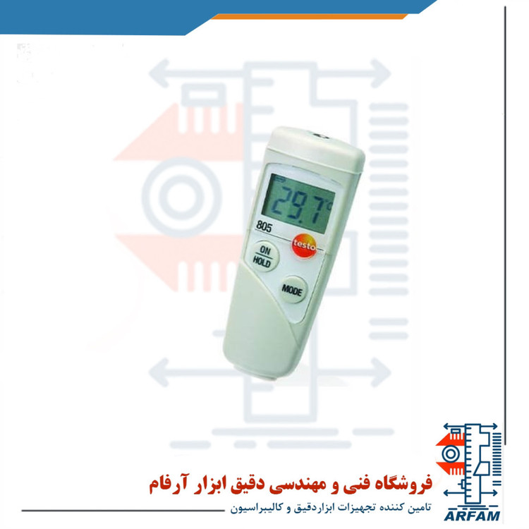 دماسنج لیزری جیبی مخصوص آشپزی برند تستو مدل TESTO 805 یک دماسنج مادون قرمز با طول تنها 80 میلی متر که در هر جیبی به راحتی قرار می گیرد و در هر مکانی برای اندازه گیری سریعا آماده است. از دستگاه برای اندازه گیری دمای کالاهای ورودی و همچنین در بررسی دمای کالا های موجود در قفسه های سوپرمارکت استفاده می شود و ابزاری مناسب برای اندازه گیری سریع در بخش مواد غذایی و فناوری تأسیسات می باشد. یک کاور محافظ برای دماسنج تستو 805 طراحی شده است که آن را در مقابل آب و ضربه حفظ می کند از لوازم جانبی های اختیاری این دستگاه محصوب می شوند. این دستگاه همچنین دارای یک حالت اسکن برای اندازه گیری طولانی مدت و یک ثابت نگهداشتن برای ثابت کردن مقادیر اندازه گیری شده است و علاوه بر این، می تواند مقادیر حداقل و حداکثر را نشان دهد. این دستگاه توامایی اندازه گیری پارامتر دما از 25- تا 250 درجه سانتی گراد را داراست و از دقت قابل ملاحظه ای برخوردار می باشد.
