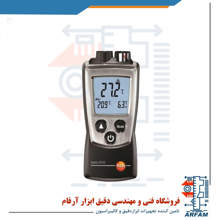 ترمومتر لیزری محیطی 300 درجه برند تستو مدل TESTO 810 قادر به اندازه گیری دمای سطحی و دمای هوا به صورت غیر تماسی می باشد و این دو داده را به همراه تفاضل آن ها به طور همزمان نمایش می دهد. این دستگاه از 2 باتری میکرو AAA با طول عمر 50 ساعت بدون نور پس زمینه تغدیه می کند و دارای یک صفحه نمایش LCD با نمایش 3 داده بوده و از کیفیت بالایی برخوردار می باشد. هر دستگاهی پس از گذر مدت زمان خاصی در اثر شرایط محیطی و یا استفاده نادرست از حالت نرمال خارج می شود و نیاز به کالیبراسیون دارد، در نتیجه این دستگاه با دارا بودن قابلیت کالیبراسیون از دستگاه های مشابه خود پیشی گرفته است. این دستگاه دارای به نور پس زمینه صفحه نمایش مجهز می باشد که اندازه گیری را در مکان های تاریک و یا کم نور آسان تر کرده و میزان خطا های اندازه گیری را کاهش می دهد.