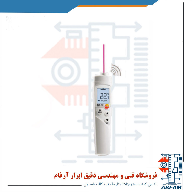 دماسنج لیزری و غیر تماسی 300 درجه برند تستو مدل TESTO 826-T2 یک وسیله اندازه گیری دقیق برای اندازه گیری دمای سطح مواد به طور نقطه ای می باشد که بسیار ایمن و سبک بوده و به راحتی در هر مکانی قابل حمل می باشد. این دستگاه از 2 باتری میکرو AAA با طول عمر حدود 20 ساعت تغدیه می کند و دارای یک صفحه نمایش LCD با نمایش 1 ردیف داده می باشد. تنظیم زنگ هشدار برای مقادیر کم و یا زیاد جریان از دیگر مزایای این دستگاه می باشد که موجب جلب توجه کاربر در شرایط خاص دمایی شده و از خطرات احتمالی جلوگیری می نماید. این دستگاه همچنین دارای نمایشگر کاهش باتری می باشد که علاوه بر اینکه زمان مناسب تعویض باتری را گوشزد می کند از خراب شده دستگاه و خطای اندازه گیری جلوگیری می نماید.