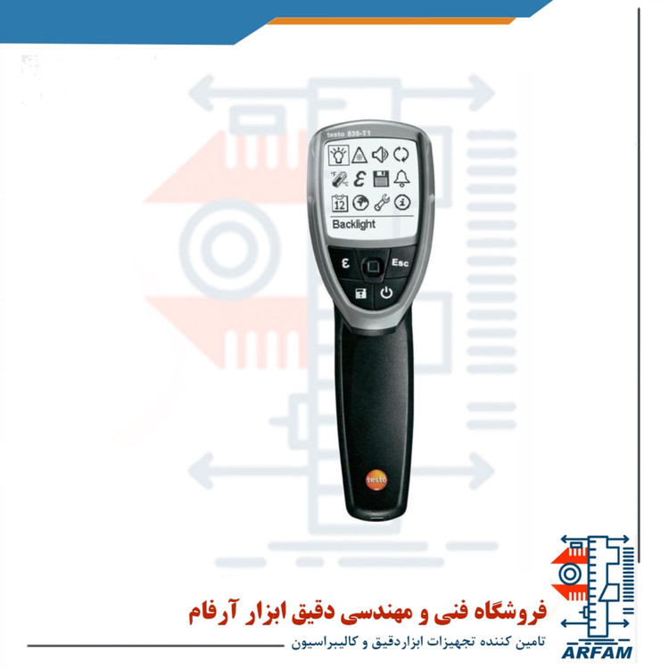 دماسنج لیزری و غیر تماسی 600 درجه برند تستو مدل TESTO 835-T1 یک وسیله اندازه گیری دقیق و قابل اطمینان است که به دلیل سبکی و کاربری آسان نظر کاربران زیادی را به خود جلب کرده است که دارای دونوع کارکرد IR و TC به طور همزمان می باشد. این دستگاه از 3 باتری مدل AA با طول عمر 25 ساعت بدون نور پس زمینه و لیزر و 10 ساعت بدون نور پس زمینه، تغدیه می کند این دماسنج دارای یک صفحه نمایش با نور پس زمینه می باشد که به منظور تسهیل کار در مکان های تاریک و همچنین کاهش خطای کاربر تعبیه شده است. به منظور صرفه جویی درانرژی و همچنین افزایش طول عمر باتری، دستگاه پس از گذشت 120 ثانیه و همچنین نور پس زمینه صفحه نمایش آن پس از گذشت 30 ثانیه به طور خودکار خاموش خواهند شد. از دیگر قابلیت های این دستگاه می توان به نمایش کاهش باتری اشاره کرد که زمان مناسب برای تعویض باتری را مشخص می کند و از آن جایی که باتری ضعیف به دستگاه آسیب زده و موجب افزایش خطا در اندازه گیری می شود، این قابلیت حایز اهمیت است. تنظیم زنگ هشدار این دستگاه در هنگام بالا یا پایین رفتن دما تا حد تعیین شده کاربر را از شرایط موجود آگاه کرده و از خطرات احتمالی جلوگیری کند.