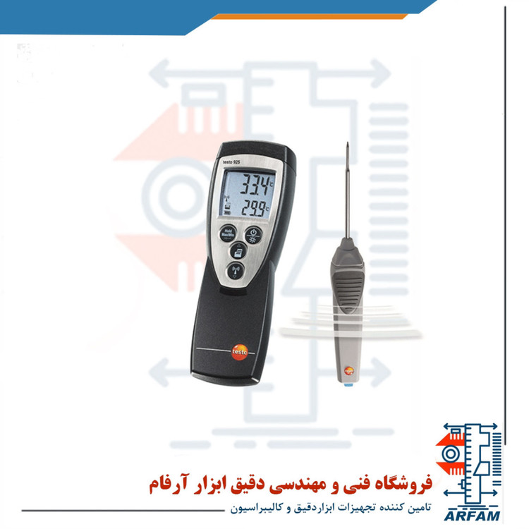 دماسنج تماسی دیجیتال 2 کاناله برند تستو مدل TESTO 922 ابزاری مناسب برای اندازه گیری دما می باشد که مخصوصاً در زمینه HVAC پرکاربرد است. این ابزار اندازه گیری مقادیر دمای دو پروب ترموکوپلی متصل شده را به طور همزمان ثبت می کند و مقادیر آن ها را در صفحه نمایش به صورت 2 ردیفه نشان می دهد. داده های اندازه گیری شده بدون اتصال کابل منتقل می شوند و علاوه بر این دستگاه قادر است تا مقادیر اندازه گیری شده توسط یک پراب رادیویی را به صورت بی سیم نمایش دهد. این دستگاه به طور مداوم مقادیر حداقل و حداکثر را اندازه گیری کرده و در صفحه نمایش نشان می دهد و کاربر می تواند در صورت نیاز این مقادیر نشان داده شده در صفحه نمایش (مقدار اندازه گیری فعلی ، مقدار اندازه گیری ثابت یا مقدار حداقل / حداکثر) را با استفاده از پرینتر چاپ کند. همچنین می توان دستگاه را به گونه ای تنظیم کرد که در فواصل زمانی مشخص داده های اندازه گیری شده را چاپ نماید. این دستگاه قابلیت اندازه گیری دما از 50- تا 1000 درجه سانتی گراد را با دقت بالایی داراست.