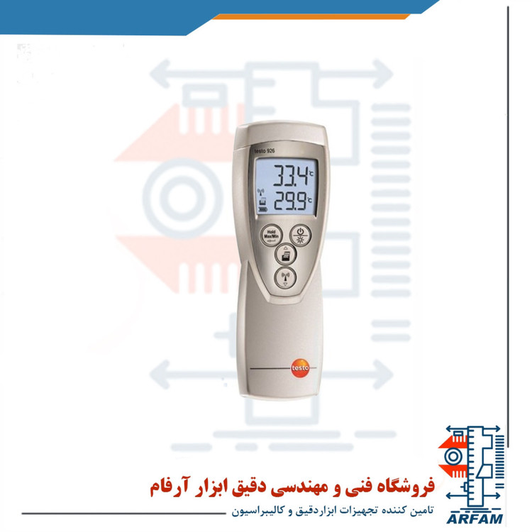 دماسنج تماسی 400 درجه صنایع غذایی برند تستو مدل TESTO 926 یک دماسنج سبک، ایمن و قابل حمل می باشد که به دلیل دقت زیاد و ایمنی بالا در بسیاری از موارد کاربرد دارد. این دستگاه یک دماسنج 1 کاناله T/C مدل T می باشد که متناسب با اندازه گیری دمای مواد غذایی در انبار ها، ماشین های حمل و نقل و حتی آشپزخانه برای حفظ دمای مناسب برای مواد غذایی ساخته و عرضه بازار شده است. منبع تغذیه این دستگاه یک باتری 9 ولت 6F22 با طول عمر گوناگون در حالت های مختلف می باشد که عبارتند از: 200 ساعت با پراب متصل شده و نور پس زمینه خاموش، 45 ساعت در حالت رادیویی و نور پس زمینه خاموش، 68 ساعت با پراب متصل شده و نور پس زمینه روشن و 33 ساعت در حالت رادیویی و نور پس زمینه روشن. صفحه نمایش این دستگاه LCD بوده و مجهز به نور پس زمینه صفحه نمایش می باشد که اندازه گیری را در مکان های تاریک و یا کم نور آسان تر می نماید و همچنین قابلیت نمایش 1 ردیف داده را دارد. زنگ هشدار دستگاه در صورت رسیدن دما به حد بالا یا پایین تنظیم شده به منظور هشدار به کاربر روشن می شود تا مانع وقوع حوادث غیر مترقبه شده و از خسارات احتمالی بکاهد. هر دستگاهی پس از گذر مدت زمان خاصی در اثر شرایط محیطی و یا استفاده نادرست از حالت نرمال خارج می شود و نیاز به کالیبراسیون دارد، در نتیجه این دستگاه با دارا بودن قابلیت کالیبراسیون از دستگاه های مشابه خود پیشی گرفته است.