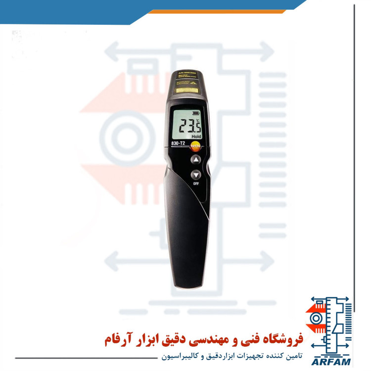 حرارت سنج و ترمومتر مادون قرمز برند تستو مدل TESTO 830-T2 یک وسیله ایمن، قابل حمل و قابل اعتماد است که به دلیل دقت و سرعت بالا جایگاه ویژگی را میان کاربران پیدا کرده است و به دلیل توانایی اندازه گیری از فاصله دور از ایمنی بالاتری برخوردار است. این دستگاه از یک باتری 9 ولت با طول عمر 15 ساعت به عنوان منبع تغذیه استفاده می کند و دارای صفحه نمایش LCD با نور پس زمینه مناسب برای مکان های تاریک و یا کم نور طراحی شده است. سرعت اندازه گیری در این دستگاه برابر 0.5 ثانیه از طریق لیزر و برابر 1.75 ثانیه از طریق پراب خارجی می باشد که از دستگاه های پر سرعت در اندازه گیری محصوب می شود. یکی دیگر از ویژگی های قابل توجه این دستگاه نمایش کاهش باتری می باشد که زمان مناسب برای تعویض باتری را به کاربر متذکر می شود زیرا باتری ضعیف علاوه بر خطا در اندازه گیری موجب خرابی دستگاه نیز می شود. تنظیم زنگ هشدار برای مقادیر کم و یا زیاد جریان از دیگر مزایای این دستگاه می باشد که موجب جلب توجه کاربر در شرایط خاص دمایی شده و از خطرات احتمالی جلوگیری می نماید.