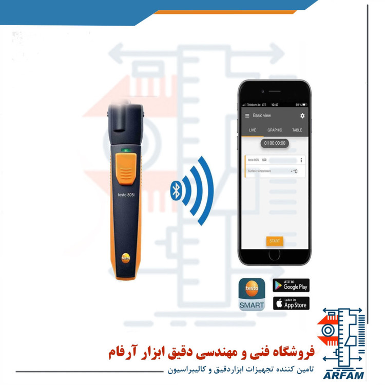 دماسنج بی سیم و هوشمند مادون قرمز برند تستو مدل TESTO 805I یک دماسنج لیزری با قابلیت اتصال به نرم افزار هوشمند می باشد که برای اندازه گیری دمای سطح مواد به طور غیر تماسی طراحی شده است که بسیار ایمن و سبک بوده و به راحتی در هر مکانی از جمله آشپزخانه ها، انبار های مواد غذایی، رستوران ها، فروشگاه ها، سوپرمارکت ها و هر مکان دیگری که اندازه گیری دما در آن امری حیاتی می باشد، قابل استفاده است. این دستگاه از 3 باتری AAA با طول عمر 30 ساعت تغدیه می کند و قابلیت اندازه گیری دما در دو واحد درجه سانتی گراد و درجه فارنهایت می باشد. این دستگاه قادر به اتصال به سیستم های هوشمند با سیستم عامل اندروید 4.3 و iOS اپل 8.3 یا جدید تر و بلوتوث 4 می باشد که کاربر می تواند عمل اندازه گیری و داده برداری را از راه دور انجام دهد و موجب راحتی در تحلیل، بررسی و اشتراک گذاری آسان آن ها می شود.