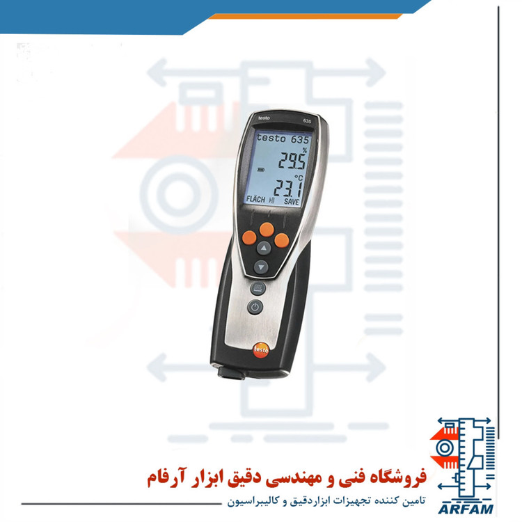دما و رطوبت سنج قابل اتصال به کامپیوتر برند تستو مدل TESTO 635-2 وسیله ای دقیق و با قابلیت اندازه گیری سریع می باشد که به منظور اندازه گیری دما، رطوبت هوا، رطوبت مواد، فشار مطلق، مقدار U و نقطه شبنم محیط ساخته و عرضه بازار شده است. این دستگاه از 2 پراب کلاسیک و 3 پراب بی سیم پشتیبانی می نماید و منبع تغذیه آن باتری منگنز قلیایی AA با طول عمر 200 ساعت است که در صورت کاهش آن، نماد باتری در صفحه نمایش ظاهر می شود که به منظور هشدار به کاربر جهت تعویض باتری ها می باشد زیرا باتری ضعیف به دستگاه آسیب زده و موجب افزایش خطا در اندازه گیری می شود. صفحه نمایش این دستگاه دارای نور پس زمینه صفحه نمایش می باشد که موجب تسهیل و تسریع کار در مکان های تاریک شده و میزان خطای کاربر را کاهش می دهد. از دیگر مزایای این دستگاه اتصال آن به کامپیوتر از طریق USB می باشد که موجب می شود تحلیل و بررسی داده ها بسیار سریع تر و راحت تر انجام پذیرد و خطا های محاسباتی را نیز کاهش می دهد. هر دستگاهی پس از گذر مدت زمان خاصی در اثر شرایط محیطی و یا استفاده نادرست از حالت نرمال خارج می شود و نیاز به کالیبراسیون دارد، در نتیجه این دستگاه با دارا بودن قابلیت کالیبراسیون از دستگاه های مشابه خود پیشی گرفته است.