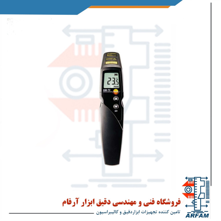 ست دماسنج مادون قرمز تفنگی برند تستو مدل TESTO 830-T2 SET با پارت نامبر 05638312 وسیله ای ایمن، قابل اعتماد و ابزاری جدا نشدنی از همه کسانی است که به طور روزانه نیاز به اندازه گیری دما دارند. این دستگاه وسیله ای پر کاربرد در صنایع غذا و دارو، پالایشگاه های نفتی، پتروشیمی، ساخت شیشه، سیمان، پزشکی، گیاهان دارویی و تست ایمنی دستگاه های گرمایشی می باشد. از ویژگی های موثر این دستگاه می توان به طول موج از 8 تا 14 میکرو متر، اپتیک بزرگ برای افزایش دقت اندازه گیری حتی از فاصله دور، سرعت اندازه گیری بالا و برابر 2 داده در ثانیه، زنگ هشدار برای 2 محدوده قابل تنظیم، طراحی ارگونومیک، اندازه گیری مقدار ماکزیمم / مینیمم، نور پس زمینه صفحه نمایش، ثابت نگهداشتن داده ها، نمایش میزان شارژ باتری، قابلیت اتصال پراب خارجی و لیزر دو نقطه ای و نسبت فاصله به قطر دایره اندازه گیری 12:1 اشاره کرد.