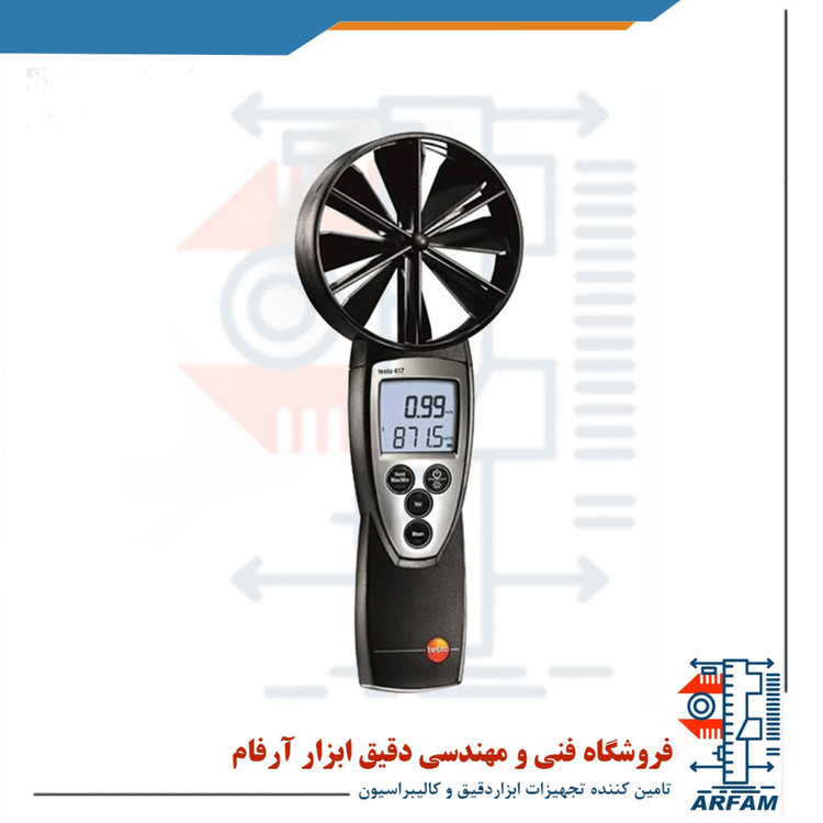 کیت بادسنج و آنمومتر به همراه قیف برند تستو مدل TESTO 417-1 با پارت نامبر 05634171 ابزاری حرفه ایست و مناسب استفاده افراد حرفه ای و آماتور می باشد و از مجموع بادسنج پره ای و دماسنج غیر تماسی تشکیل شده است که توانسته جایگاه ویژه ای را به خود اختصاص دهد. از ویژگی های دیگر این دستگاه شامل اندازه گیری مقدار ماکزیمم / مینیمم، ثابت نگهداشتن داده ها، خاموش شدن خودکار، نور پس زمینه صفحه نمایش، محاسبه مقدار میانگین، تشخیص جهت جریان می باشد.