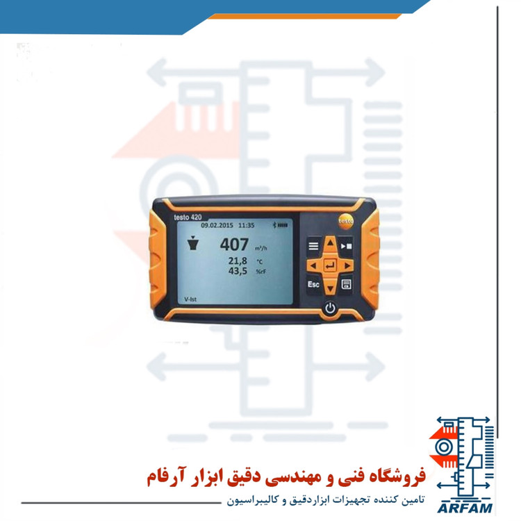 یک ابزار سبک، دقیق و مناسب برای متعادل سازی جریان حجمی در کانال ها و مجاری دور از دسترس است. در جریان های آشفته، صاف کننده های جریان ثبت شده به طور قابل توجهی دقت و ثبات اندازه گیری را بهبود بخشیده و باعث صرفه جویی در زمان و حذف اندازه گیری مجاری خروجی آشفته غیر ضروری می شود. قرار دادن دستگاه در موقعیت مناسب به ویژه با دسته های ارگونومیک و وزن کمتر از 6.4 پوند بسیار آسان می باشد. هود جریان TESTO 420 از لوازم جانبی قابل خرید این دستگاه می باشد که دارای تنوع گسترده ای از دامن های جریان قابل تعویض در اندازه ها و تنظیمات مختلف می باشد. رنج های اندازه گیری این دستگاه شامل جریان حجمی از 25 تا 2300 CFM یا از 40 تا 4000 متر مکعب در ساعت، سرعت جریان از 0 تا 2750 فوت بر دقیقه یا از 0 تا 14 متر بر ثانیه، دمای جریان هوا از 5- تا 140 درجه فارنهایت یا از 20- تا 60 درجه سانتی گراد، فشار تفاضلی از 0.5- تا 0.5 inWC یا 120- تا 120 پاسکال، فشار مطلق از 700 تا 1100 میلی بار، رطوبت نسبی از 0 تا 100 درصد RH، نقطه شبنم از 20 تا 140 درجه فارنهایت و لامپ مرطوب از 104- تا 140 درجه فارنهایت می باشد.
