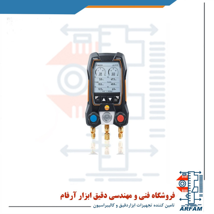 کیت منیفولد 2 سوپاپ با پراب بی سیم هوشمند برند تستو مدل TESTO 550S SMART KIT قابلیت اندازه گیری پارامتر های فشار از 14- تا 870 سای یا از 1- تا 60 بار با دقت ±0.5%fs و دما از 58- تا 302 درجه فارنهایت با دقت ±0.9°F را داراست. این دستگاه از امکانات پر اهمیتی چون صفحه نمایش بزرگ با قابلیت نمایش داده ها در یک صفحه، نمایش سریع مقدار فشار به صورت آنالوگ، به روز رسانی خودکار لیست یخچال ها، کاربری آسان، نمایش میزان شارژ باتری، نور پس زمینه صفحه نمایش، خاموش شدن خودکار بهره مند می باشد.