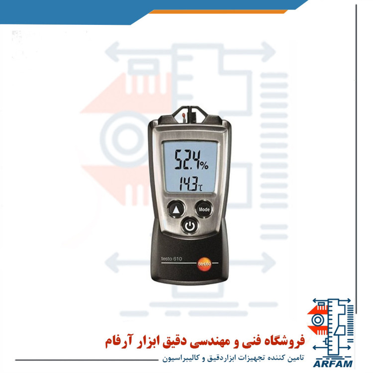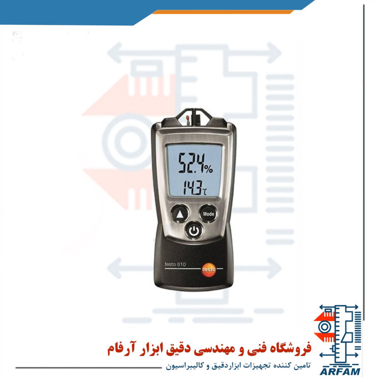 دستگاه اندازهگیری رطوبت هوا تستو TESTO 610 دما را در بازه 10- تا 50 درجه سانتیگراد با دقت 0.5± درجه سانتیگراد و رزولوشن 0.1 درجه سانتیگراد اندازه میگیرد. رطوبت نیز در بازه صفر تا RH% 100 با رزولوشن RH% 0.1 و دقت RH% ±2.5 اندازهگیری میشود. علاوهبراین این دستگاه مقدار دمای حباب تر و نقطه شبنم را محاسبه میکند و قادر است مقادیر مینیمم و ماکزیمم را نیز در اختیار کاربر قرار دهد. نمایشگر دارای نور پس زمینه است و برای یادداشت برداری لحظهای میتوان مقادیر به دست آمده را روی نمایشگر فریز کرد.