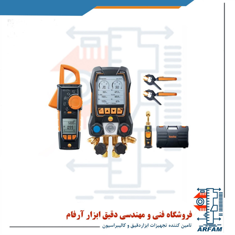 کیت خلا هوشمند تستو به همراه یک کلمپ مترsmart vaccum kit testo 570s با پارت نامبر 0564 5704 متشکل از یک مانیفولد دیجیتالی 4 ولوی˛ یک کلمپ متر TRMS 770-3˛ 2 کلمپ ترمومتر 115i و 1 پروپ خلا 552i میباشد مانیفولد دیجیتالی فشار را در بازه 1- تا 60 بار با دقت fs ±0.25% اندازه میگیرد درحالیکه رزولوشن آن برابر با 0.01 بار میباشد. دما نیز در بازه 50- تا 150 درجه سانتیگراد با دقت 0.5± درجه سانتیگراد و رزولوشن 0.1 درجه سانتیگراد اندازهگیری میشود. این ابزار با اتصال پروپ 115i دما را با دقت 1.3± و رزولوشن 0.1 درجه سانتیگراد در بازه 40- تا 150 درجه سانتیگراد میسنجد.