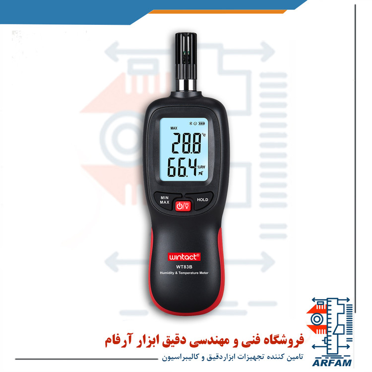 رطوبت سنج و ترمومتر بلوتوثی وینتکت WINTACT WT83B توانایی اندازه گیری چهار پارامتر رطوبت، دما، نقطه شبنم و دمای حباب تر را دارد. این رطوبت سنج، دارای صفحه دیجیتالی است که توانایی نمایش همزمان دما و رطوبت را دارد. همچنین میتواند دما را با دو واحد سلسیوس و فارنهایت نمایش دهد. علاوه بر این، صفحه دارای نور پس زمینه است که استفاده را در محیط های کم نور ممکن می سازد.همچنین اندازه گیری رطوبت، دما در رنج -20 تا 70 درجه سانتیگراد و نقطه شبنم و دمای حباب تر در رنج -20 تا 50 درجه سانتیگراد را انجام می دهد.