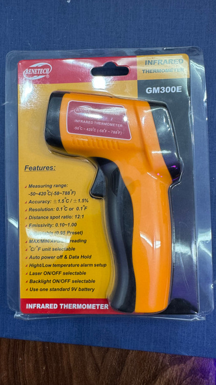 ترمومتر و دماسنج لیزری مدل BENETECH GM300E یک ترمومتر لیزری تفنگی ارزان قیمت برای اندازه گیری دما به صورت غیر تماسی و بوسیله لیزر مادون قرمز با دقت 1.5% از برند بنتک چین میباشد. از ویژگیهای مهم این ترمومتر لیزری ارزان قیمت میتوان به اندازه گیری بازه گسترده دمایی از 50- تا 420 درجه سانتیگراد با وضوح 0.1 یکدهم ، و فاصله ارزیابی شده 12 متر و ضریب تبدیل دمایی از سانتیگراد به فارنهایت ، قابلیت تنظیم ضریب تابش EMS اشاره کرد.