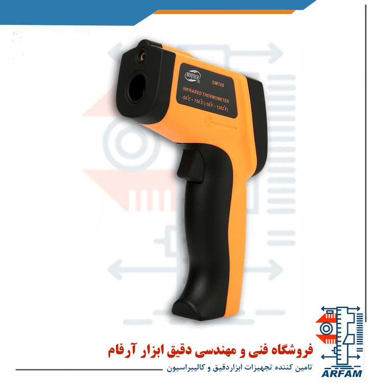 ترمومتر لیزری 750 درجه بنتک BENETECH GM-700 قابلیت اندازه گیری دما در محدوده -50 ~ 750℃ رابا دقت ±1.5℃ دارد. ترمومتر GM-700 با نمایشگر چراغ دار با قابلیت تنظیم ضریب تابش EMS محصول کمپانی BENETECH میتواند اهداف تا فاصله 12 متری را با لیزر مادون قرمز هدفگیری کند. این دستگاه میتواند دمای سطح هدف مورد نظر ، بخصوص مواقعی که جسم در حال حرکت باشد و یا در محل غیر قابل دسترسی باشد و یا ترموکوپل یا دیگر سنسورهای نوع پروب نمیتوانند استفاده شوند، بدون تماس و از فاصله دور اندازه گیری کند.