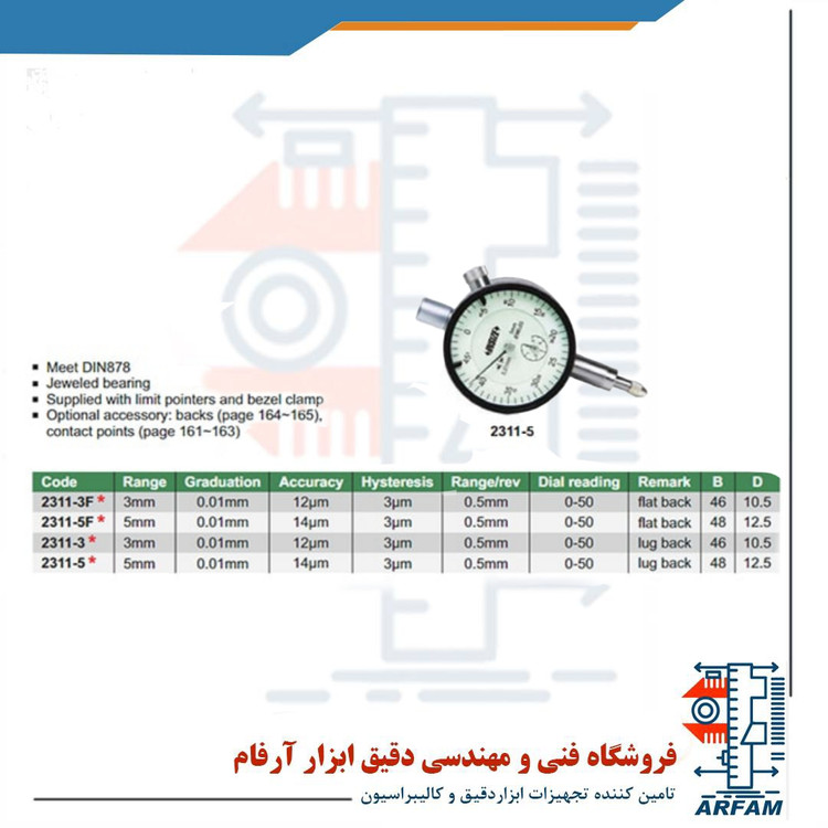 ساعت اندیکاتور اینسایز کد 3-2311 محصولی کاربردی برای سنجش و اندازه گیری است. این محصول در کد های گوناگون عرضه شده که هر کدام دارای سایز و قابلیت های متفاوت است. ناگفته نماند؛ تمامی کد های این محصول در ابزار آرفام موجود و قابل سفارش است. این کد از محصول دارای دو نوع پشت صاف یا گیره دار است که به lug back یا flat back شناخته می شوند. محصولی مشاهده می کنید از نوع گیره دار یا همان lug back می باشد. کد دیگر این محصول با نام ساعت اندیکاتور اینسایز کد 3Fــ2311 فاقد گیره و flat back می باشد. این محصول دارای رنج اندازه گیری 3 میلی متری و دقت 12 میکرون می باشد. همچنین فاصله تقسیم بندی ساعت این ابزار 0.01 میلی متر است. ناگفته نماند؛ محدوده خوانایی این ابزار از 0 تا 50 را دربر می گیرد