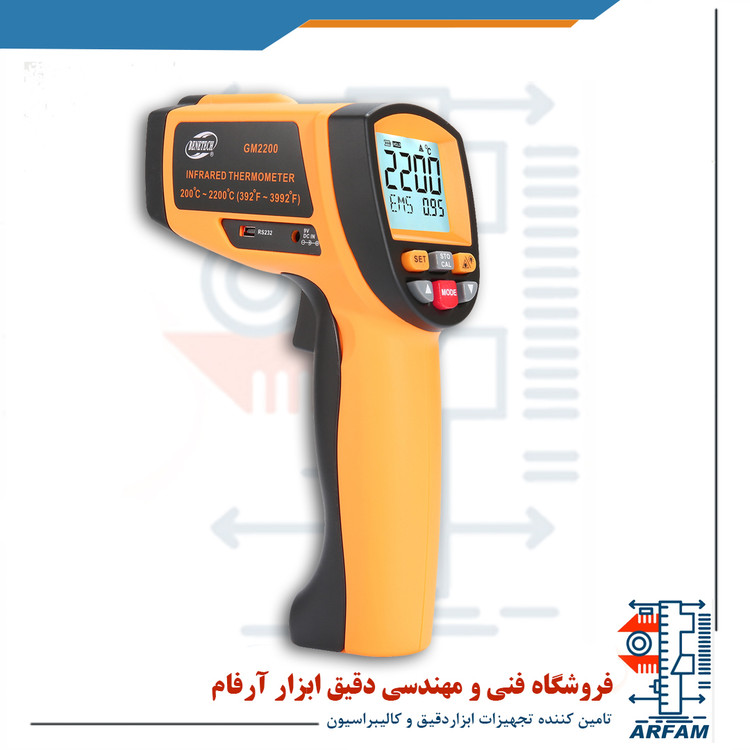 ترمومتر یا دماسنج لیزری بنتک BENETECH GM2200 یک ترمومتر لیزری تفنگی ارزان قیمت جهت اندازه گیری دما به صورت لیزری یا غیر تماسی با دقت 1.5% و ثبات 1 درجه سانتیگراد از برند بنتک چین میباشد. از ویژگیهای مهم این ترمومتر لیزری ارزان قیمت میتوان به اندازه گیری بازه گسترده دمایی از 200 تا 2200 درجه سانتیگراد با وضوح 0.1 یکدهم ، و فاصله ارزیابی شده 80 متر و ضریب تبدیل دمایی از سانتیگراد به فارنهایت ، درجه نمایشگر با نور پس زمینه اشاره کرد.