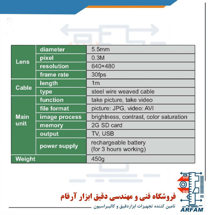 بروسکوپ دیجیتال مانیتوردار اینسایز مدل isv-e10 دارای زاویه دید لنز 54 درجه و وزن 450 گرم میباشد. دارای رزولوشن (0/3 میلیون پیکسل) 640x480 با 30 فریم در ثانیه و دارای 2 پورت خروجی میباشد.