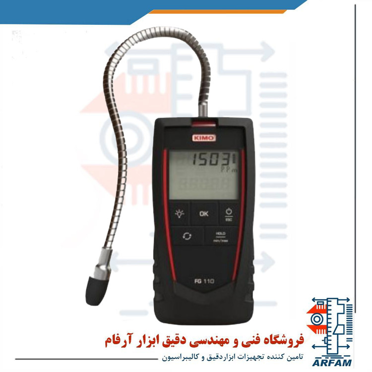 دتکتور،نشت یاب گاز شهری مدل KIMO FG110 دارای حسگر نیمه هادی است و صفحه نمایشگر آن از LCD چهر خط با ابعاد 36×50 میلی متر ساخته شده است. 5 کلید نیز بر روی دستگاه دارد . پراب این نشت یاب گاز قابلیت انعطاف دارد و طول آن به 30سانتی متر میرسد . دارای جنس ABS و حفاظت IP54 است و تغذیه دستگاه بوسیله 4 باتری نیم هقلمی 1.5 ولت است ، همچنین نشت یاب گاز فوق بعد از 20 ساعت از حالت کار خودکار خارج میشود و دارای تنظیم خاموشی خودکار از صفر تا دو ساعت میباشد . دمای کارکرد دستگاه بین دمای صفر تا 50 درجه سانتی گراد است و محیط هایی در ارتفاع صفر تا 2000 متر نیز به شرط نا متغیر بودن شرایط غلظت هوا میباشد. دتکتور گاز FG110 را در دمایی بین منفی 20 تا 80 درجه سانتی گراد نگهداری کنید. وزن نشت یاب گاز نیز 295 گرم اندازه گیری شده است.
