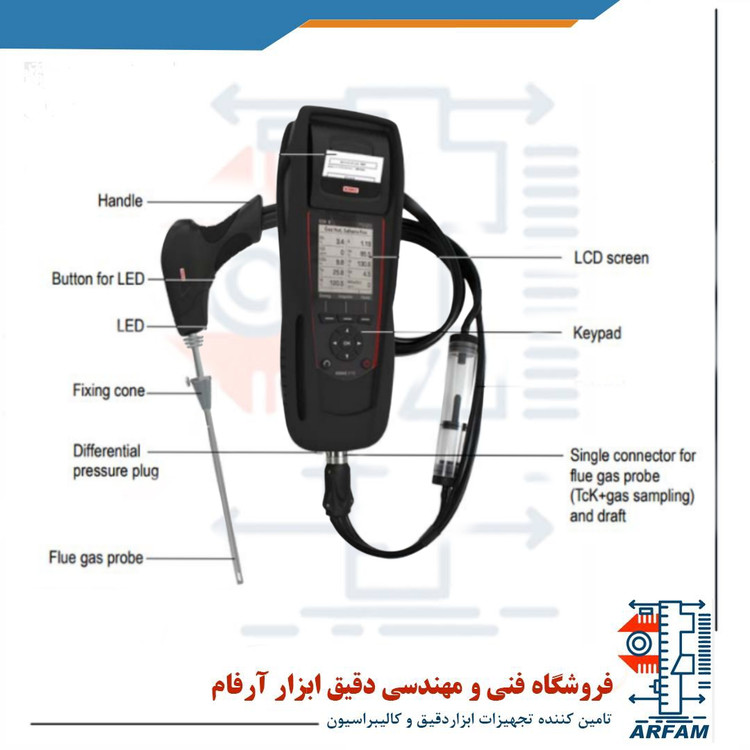 فشار تفاضلی نیز با استفاده از سنسور پیزوالکتریک از 20000- تا 20000 پاسکال با رزولوشن 1 پاسکال اندازه گرفته میشود و دقت اندازهگیری تا 20000 پاسکال برابر با 0.5%± میباشد. مقدار اتلاف تا 100% و رزولوشن 0.1%˛ مدار هوای اضافی تا 9.99 و رزولوشن 0.01 قابل اندازهگیری است. ماکزیمم مقدار رادمان پایین و بالا در این ابزار تا 100% و 120% میباشد.