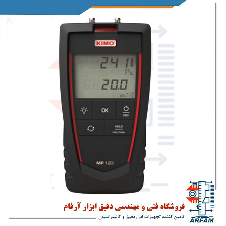 مانومتر دیجیتالی کیمو KIMO MP 120 قابلیت اندازهگیری فشار را در واحدهای pa˛ inWg˛ daPa˛mmH2O˛ m/s و fpm دارد و بازه اندازهگیری آن pa 1000- تا pa 1000 میباشد. رزولوشن اندازهگیری pa 1 و دقت برابر با pa ±2 r ±0.5% میباشد. سرعت هوا نیز در واحدهای m/s˛ fpm و km/h قابل اندازهگیری است و بازه اندازهگیری آن بین 0 تا 40 متر بر ثانیه قرار دارد به طوریکه رزولوشن برابر 0.1 متر بر ثانیه و دقت اندازه گیری آن از 2 تا 5 متر بر ثانیه برابر با 0.7± متر بر ثانیه و از 5 تا 40 متر بر ثانیه برابر با 0.3± r ±0.5% متر برثانیه میباشد.