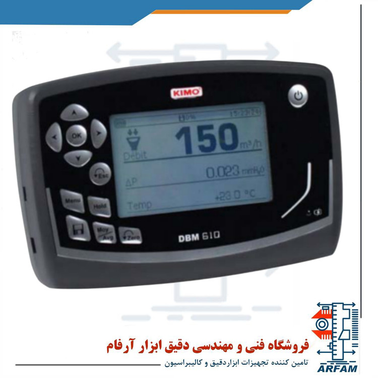 فلومتر کیمو KIMO DBM 610 از دو قسمت واحد اندازهگیری و هود تشکیل شده است که بر حسب نیاز میتوان آن را با هودهای دیگر و با اندازههای متفاوت تعویض کرد. قسمت اصلی بدنه این ابزار را میتوان به عنوان یک مانومتر جداگانه با استفاده از لولههای پیتوت و سیلیکون استفاده نمود. این ابزار میتواند به طور همزمان جریان هوا و دمای هوا را اندازه گرفته و جهت جریان هوا را هم مشخص کند. جریان هوای عبوری از m3/h 40 تا m3/h 3500˛ سرعت هوا از m/s 0.2 تا m/s 10 و دمای پایه از 0 تا 50 قابل اندازهگیری است. همچنین در صورت اتصال ترموکوپلهای K˛ J˛ T و S نیز میتوان دما را حداقل از 200- تا 1760 درجه اندازه گرفت. علاوهبر این˛ این فلومتر فشار را هم در بازه 2500± پاسکال اندازه میگیرد. در این ابزار 200 دیتاست 100 نقطهای قابل ذخیره است و یک نمایشگر LCD بزرگ همراه با نور صفحه نمایش دارد. همچنین قابلیت میانگیری خودکار و یا میانگینگیری نقطه به نقطه نیز در