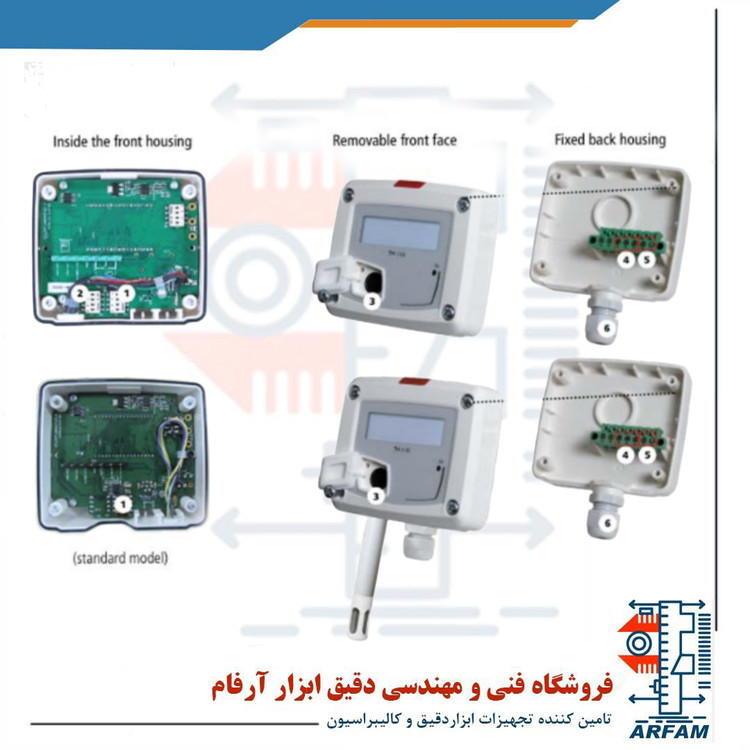 دما نیز در مدل ambient و standard از صفر تا 50 درجه سانتیگراد و در مدلهای duct و remote در بازه 20- تا 80 درجه سانتیگراد قابل اندازهگیری است. مقدار دما در خروجی آنالوگ از صفر تا 50 درجه سانتیگراد قابل نمایش است. دقت اندازهگیری در مدل ambient برابر با 0.3± r±0.4% و در مدلهای دیگر در بازه 20- تا 70 درجه سانتیگراد برابر با 0.3± و خارج از این بازه دمایی برابر با 0.5± درجه سانتیگراد است. رزولوشن اندازهگیری دما برابر با 0.1 درجه سانتیگراد و برای اندازهگیری دما از سنسور NTC استفاده میشود زمان اندازهگیری نیز برابر با 1/e (63%) 15 ثانیه میباشد.