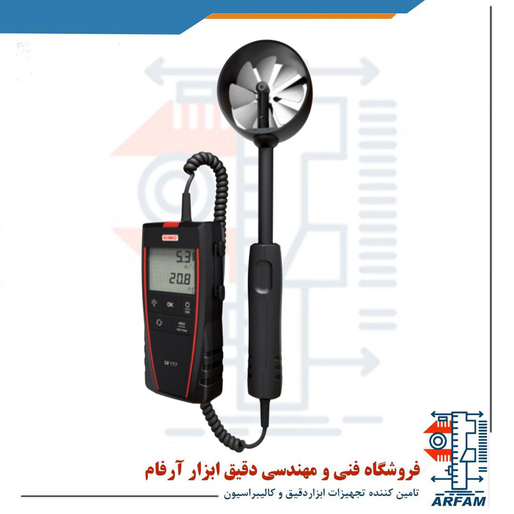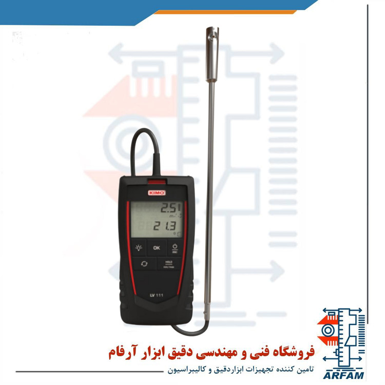 LV 110 ، LV 111 و LV 117 سه مدل سرعت سنج باد پره ای و پراب مجزا برند KIMO کشور فرانسه می باشند که قابلیت اندازه گیری سرعت باد ، دبی عبوری هوا و دما را دارا می باشند. تفاوت در سه مدل دستگاه در سایز پره های آن و قابلیت اتصال به مخروط جریان هوا جهت سنجش دقیق دبی خروجی کانال ها می باشد که مدل سرعت سنج پره ای دیجیتال کیمو مدل LV 111 پره ای با قطر 14 میلی متر ، مدل LV 117 پره ای با قطر 70 میلی متر و مدل LV 110 پره ای با قطر 100 میلی متر دارد و فقط در مدل های LV 110 و LV 111 قابلیت اتصال به مخروط جریان هوا را دارد.طول کابل تلفنی دستگاه در حالت معمولی 0.45 متر و در حالت کشیده تا 2.4 متر می باشد.جنس بدنه آن ABS مقاوم در برابر ضربه است و با داشتن کلاس حفاظتی IP54 گزینه مناسبی برای استفاده در صنعت می باشد.می توان پارامتر های اندازه گیری سرعت را بر اساس m/s ، fpm ، km/h ، دبی جریان عبوری هوا را بر اساس m3/h ، cfm ، I/s ، m3/s و دما را بر اساس C و F مشاهده کرد. از قابلیت های دیگر این آنمومتر باد پراب مجزا می توان به قابلیت نمایش مینیمم و ماکزیمم مقادیر اندازه گیری و دارای HOLD جهت ثابت کردن مقادیر اندازه گیری شده بر روی نمایشگر اشاره کرد.