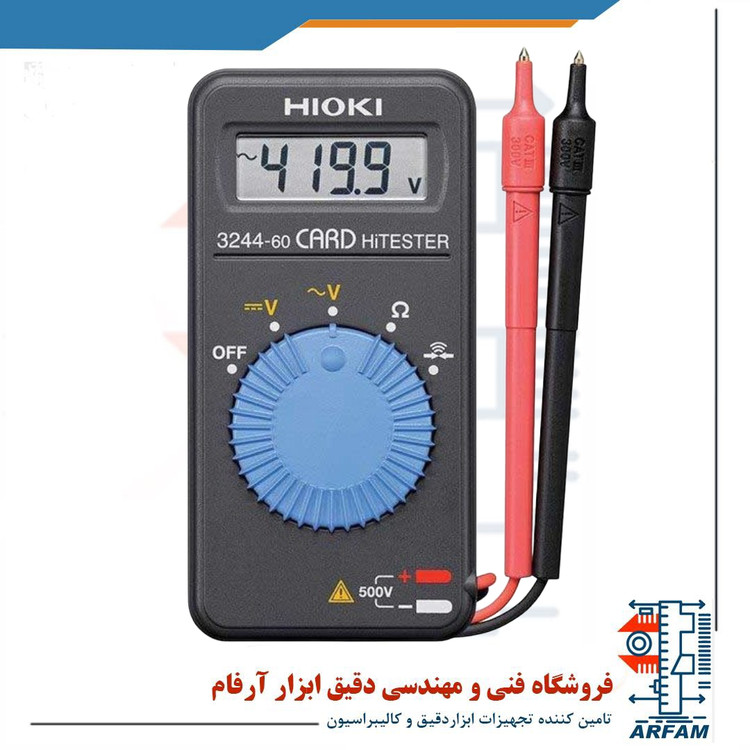 مولتی متر مدل 3244-60 یک مدل دیجیتال و به شکل کارت از مولتی متر است که برای انجام تست و همچنین کارها و تعمیرات کلی الکتریکی به کار می روند و شامل سیم های تستی هستند که ورقه آنها از طلا ساخته شده است تا تماس بهتری را ایجاد کنند. این ورقه های طلا به اندازه 15 میلی متر در قسمت انتهایی سیم ها و به منظور ایجاد تماس به کار رفته اند. پین تستهای عایق بکار رفته در این دستگاه همچنین از اتصالات کوتاه جلوگیری می کند. این دستگاه دارای ویژگی تعیین بازه بصورت خودکار و همچنین ذخیره خودکار نیروی حاصل از باتری می باشد. این دستگاه این ویژگی را دارد تا به راحتی و در همه حال مورد استفاده قرار گیرد که دلیل آن هم ضخامت کم آن (کمتر از 1 سانتی متر) است. این مولتی متر دارای ویژگی مربوط به نگهداری نیرو بصورت خودکار است. ویژگی دیگر این مولتی متر داشتن صفحه نمایش ال سی دی است که حداکثر 4199 رقم را در خود جای میدهد. این محصول همچنین از این قابلیت برخوردار است تا میزان نمونه برداری را به تعداد 2.5 دفعه در هر ثانیه انجام دهد. بازه ولتاژ DC مولتی متر مدل 3244-60 تا 500 ولت است. بازه ولتاژ AC این مولتی متر تا 500 ولت است که مشخصه های فرکانسی تا 1 کیلوهرتز می باشد. بازه مقاومتی این مولتی متر تا 41.99 مگا اهم است