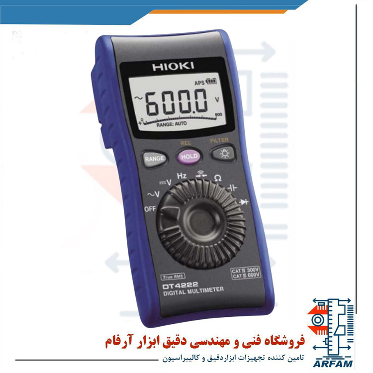 مولتی متر هایوکی مدل DT4222 یک مدل دیجیتال و جیبی از مولتی متر است که به طور ویژه برای تست هایی با اهداف کلی طراحی شده است. پهنای باند این دستگاه تا 1 کیلوهرتز AC ولت است. بازه ولتاژ DC مولتی متر هایوکی مدل DT4222 تا 600 ولت است. بازه ولتاژ AC این مولتی متر نیز تا 600 ولت است مشخصه های فرکانسی آن تا 1 کیلوهرتز می باشد. بازه مقاومت این مدل تا 60 مگا اهم می باشد. محدوده گنجایشی این دستگاه تا 10 mF می باشد. بازه فرکانسی این محصول در اندازه گیری ولتاژ AC تا 9.999 کیلوهرتز می باشد. به دلیل فیلترهای موجود در این مولتی متر، این دستگاه هارمونی بالایی در زمان اندازه گیری از خود نشان می دهد. یکی دیگر از ویژگی های این دستگاه این است که امنیت بالایی در بدنه های فشرده و طراحی های سبک وزن ایجاد می کند. همچنین طراحی قدرتمند این دستگاه باعث می شود تا در برابر ضربات حاصل از افتادن یک جسم از ارتفاع یک متری مقاوم باشد. نمایش نور پس زمینه هم از قابلیت های دیگر این دستگاه می باشد.