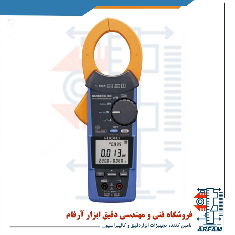 پاورمتر کلمپی AC هیوکی مدل HIOKI CM 3286-50 با قطر دهانه 46 میلیمتری و با استفاده از روش TRMS جریان AC را تا 600 آمپر˛ ولتاژ AC را تا 600 ولت و توان تکفاز را در این مدار تا 360 کیلو وات و سه فاز را تا 1080 کیلو وات اندازه میگیرد. مقدار فرکانس نیز تا 999.9 هرتز سنجیده میشود. این ابزار دارای قابلیت گستره یابی خودکار بوده و برای مصرف بهینه باتری به صورت خودکار خاموش میشود. همچنین دارای فانکشن Datahold دستی و خودکار است و مقادیر مینیمم˛ ماکزیمم و متوسط اندازهگیریها را نیز در اختیار کاربر قرار میدهد. از آنجایی که این ابزار از اتصال بلوتوث پشتیبانی میکند˛ میتوان با استفاده از آداپتور Z3210 مقادیر اندازهگیری شده را به تلفن همراه یا تبلت انتقال داد. از ویژگیهای دیگر این پاورمتر میتوان به قابلیت تشخیص فاز˛ محاسبه پیک موج و نمایش عدم بالانس توان سه فاز اشاره کرد.