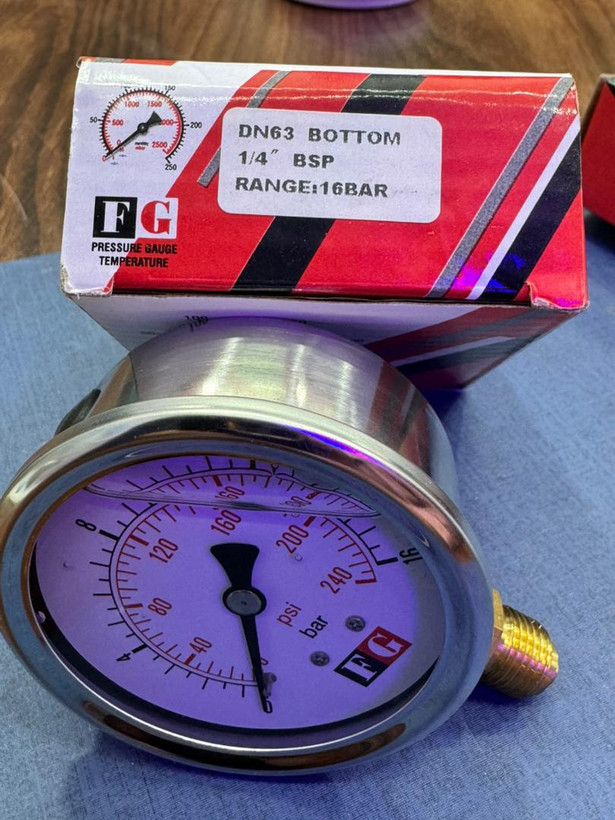 گیج فشار FG از جمله گیج فشار برند مطرح FG چین و مورد استفاده در صنعت میباشد. این مدل گیج فشار از نوع روغنی بوده و دارای صفحه 60 میلی متر میباشد.همچنین جنس بدنه از فلز و جنس رزوه آن از برنج تشکیل شده است. سایز رزوه 1/4 اینچ بوده و بصورت عمودی است. این گیج فشار متغیر بوده و با توجه به نیاز مشتری قابل تغییر است.